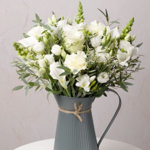 An exquisite arrangement featuring elegant white Calla Lilies gracefully surrounded by white snapdragon and a white Rose. Complemented by Freesias, Carnations with Eucalyptus greenery.